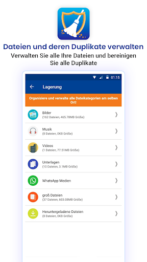 Nutzen Sie den Datei-Explorer optimal, um auf Ihrem Gerät gespeicherte Dateien effizient zu verwalten. Dies ist eine erstaunliche Funktion von Cleaner For Android zum Kategorisieren von Dateien und Ordnern. Darüber hinaus können Sie Ihre Dateien freigeben, entfernen und sichern.