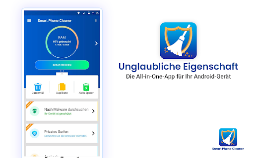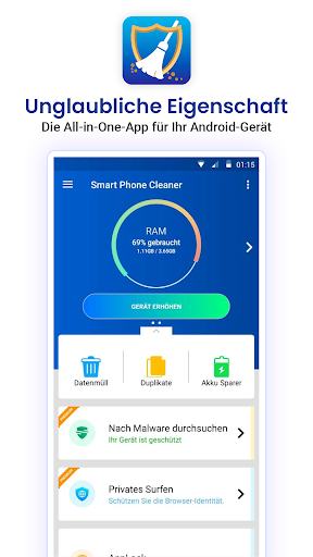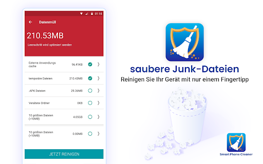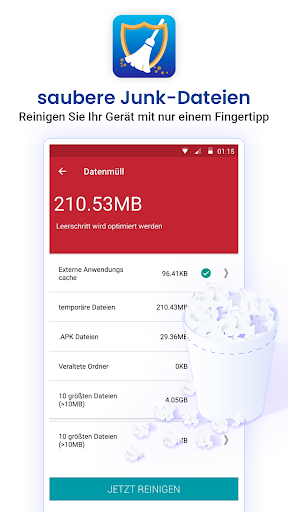 Bei kontinuierlicher Nutzung wird ein Android-Gerät mit Hunderten von Junk-Dateien überfüllt. Das Auffinden und Bereinigen all dieses Mülls ist nicht einfach, aber mit Cleaner For Android können Sie Ihr Gerät bereinigen und entstören, um Speicherplatz freizugeben und die Leistung Ihres Geräts zu verbessern.