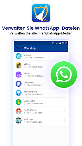 Mit Cleaner For Android können Sie alle Ihre WhatsApp-Medien an einem einzigen Ort anzeigen und verwalten. Auf diese Weise können Sie Speicherplatz freigeben, der von WhatsApp-Medien übernommen wird, und die Leistung Ihres Geräts verbessern.
