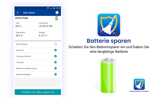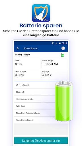 Mit Cleaner For Android können Sie den Akkuverbrauch Ihres Geräts analysieren und Apps beenden, die zu einem Entladen des Akkus führen. Die Batterieentladung kann auf Apps zurückzuführen sein, die nicht mehr verwendet werden, oder auf Apps, die im Hintergrund ausgeführt werden. Sie können solche Apps schließen und Batteriestrom sparen. Darüber hinaus wird auch die Gerätetemperatur angezeigt.