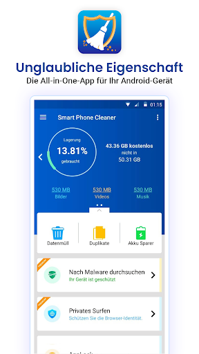 Cleaner For Android ist eine Allrounder-App für Android-Geräte. Es steigert und optimiert die Leistung Ihres Android-Geräts und entfernt unerwünschte Apps und Dateien, um Speicherplatz wiederherzustellen. Mit dem One-Tap-Booster können Sie alle Cache-Dateien innerhalb kurzer Zeit bereinigen. Es optimiert den Akku des Telefons weiter, bereinigt alle Junk-Dateien, verwaltet Apps und schützt Ihr Gerät sogar vor Malware-Angriffen. Alle diese Module wurden erstellt, um die Gesamtleistung des Geräts zu verbessern.