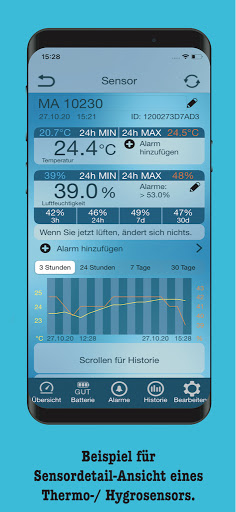 Die selbsterklärende, grafische Benutzeroberfläche der App ist intuitiv bedienbar und kann individuell an Ihre Bedürfnisse angepasst werden. Legen Sie für jeden Funksensor einen eigenen Namen fest und richten Sie selbst spezifische Alarmgrenzen ein. Bei Überschreiten dieser Alarmgrenzen melden die Funksensoren unmittelbar die Störung an Ihr Smartphone und bieten Ihnen somit das PLUS an Sicherheit.