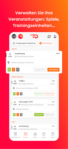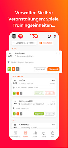 🗓️ PLANUNG: Fügen Sie schnell und einfach Ihre wiederkehrenden Veranstaltungen (Trainings), einmalige Veranstaltungen (spezielle Trainings, Meetings, Partys) oder Spiele hinzu. Verwalten Sie Ihren Kalender auf einen Blick und verpassen Sie keine wichtigen Veranstaltungen mehr.