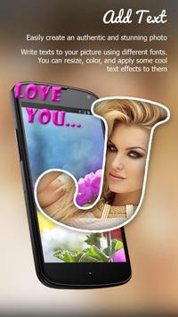 Add text to your pictures easily with Photo Text - Alphabet on Picture. Just select your photo, write your message text in the editor and press the Auto Effect button for instant cool looking text.