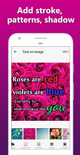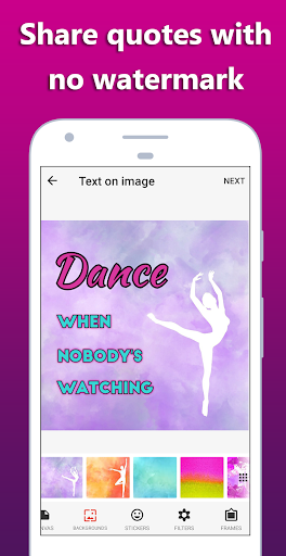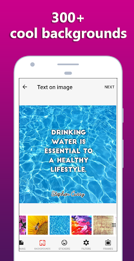 Wählen Sie einige schöne Hintergründe zum Schreiben von Zitaten. Verwenden Sie einen der fantastischen Hintergründe, die Ihnen die App Text on Image bietet. Wählen Sie zwischen Textur-Hintergründen, Blumen, Natur, Farb-Hintergründen, Abstrakt, Notizen und Vintage-Hintergründen. Es stehen mehr als 200 Zitat-Hintergründe zur Auswahl.