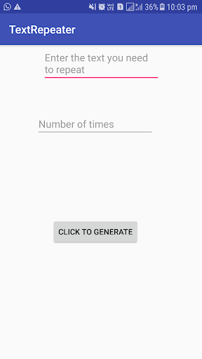 Sometimes we need to type the same text more than 10 times. It is difficult for us to type it each time or copying it. This app helps to make this work simple. You just need to enter the text once and type the number of time you need it to repeat, the text will repeat to the given number of time.