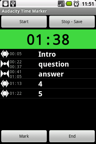 Starten Sie einfach diese App anGleichzeitig starten Sie die Aufnahme, fügen Markierungen hinzu und drücken Sie "STOP - SAVE", um Ihre Marker zu speichern.Dann können Sie die Markiererdatei in der Kühnheit zusammen mit Ihrer Aufnahme importieren.