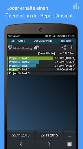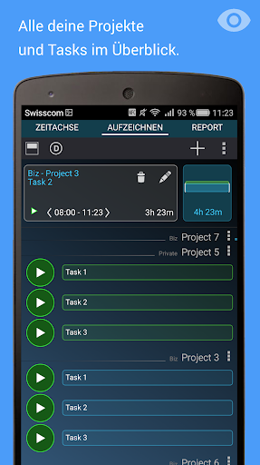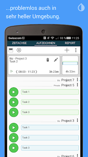 Die App ermöglicht effiziente und genaue Zeiterfassung. Die Benutzeroberfläche ist speziell für Geräte mit Touch-Screen optimiert und unterscheidet sich deutlich von einer herkömmlichen PC-Anwendung. Mit nur einer Berührung wechselt man von einem Projekt-Task zum nächsten und registriert so mit minimalem Aufwand die Arbeitszeit bzw. die für diese Aufgabe aufgewendete Zeit. Mit einfach abrufbaren on-the-fly Statistiken behält man jederzeit die Übersicht.