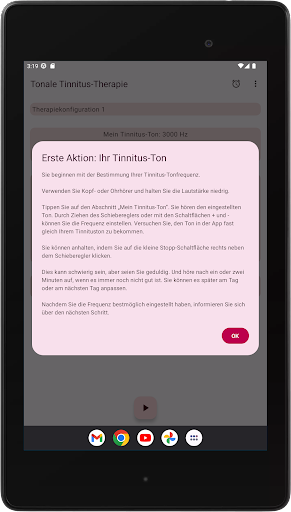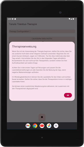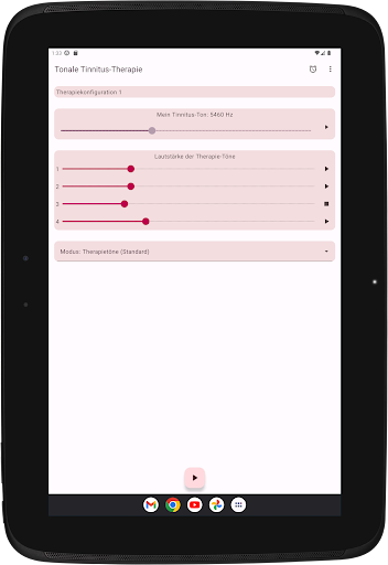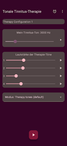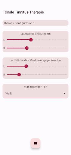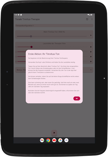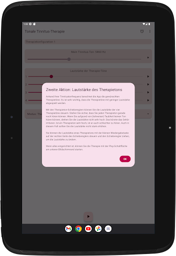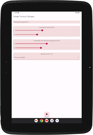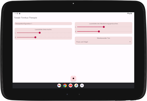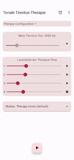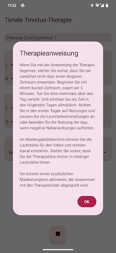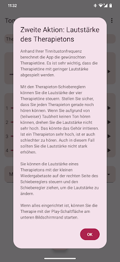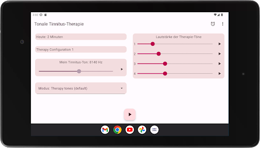 Die App konfiguriert vier Therapietöne, zwei unterhalb und zwei oberhalb Ihres Tinnitus-Tons. Die akustische Neuromodulation verwendet diese Therapietöne in Reihen von zwölf mit einem kurzen Zeitintervall, um Ihren Tinnitus-Ton zurückzusetzen. Bevor Sie mit der Wiedergabe dieser Reihe von Therapietönen beginnen, müssen Sie überprüfen, ob Sie jeden Therapieton mit derselben Lautstärke hören. Sie können die Lautstärke jedes Therapietons bei Bedarf anpassen. Dann können Sie mit dem Spielen der Therapietöne beginnen. Während der Wiedergabe können Sie die Lautstärke für den linken und rechten Kanal im Hauptbildschirm ändern. Sie können den Hauptbildschirm schließen und jederzeit wieder öffnen. Das Spielen der Therapietöne erfolgt im Hintergrund. Während der Ausführung wird das App-Symbol in der Benachrichtigungsleiste angezeigt.