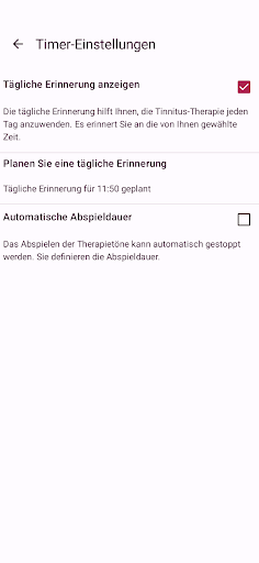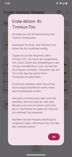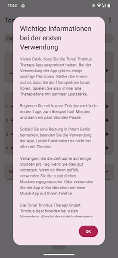 Wenn Sie an Hyperakusis leiden, seien Sie vorsichtig, wenn Sie die App verwenden. Beginnen Sie mit einigen kurzen Nutzungsperioden bei sehr geringem Lautstärken. Wenn die Therapietöne negative Auswirkungen haben, verwenden Sie die App nicht weiter.
