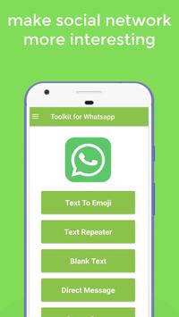 Whatskit ,Toolkit whatsapp,Tool Kit (Whatsapp) contains all tools for whatsapp to make your whatsapp experience very smooth and entertaining. You will get everything in a single app. From whatsapp tools top stylish texts, opening whatsapp messages chat, amazing quotes and tricks for texts and emojis, power tools and whatsapp trim tools.