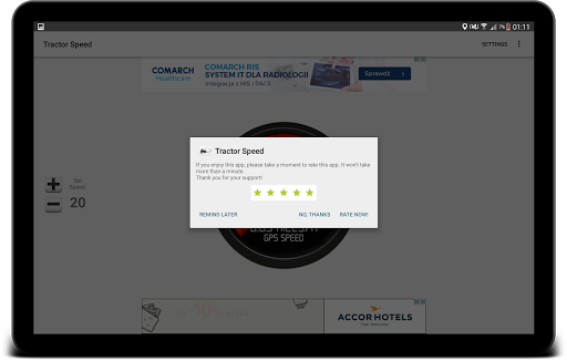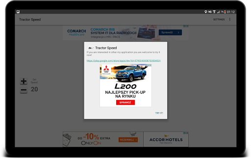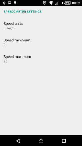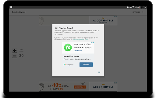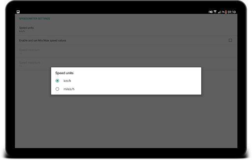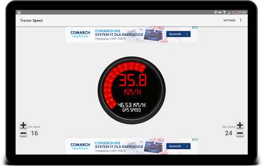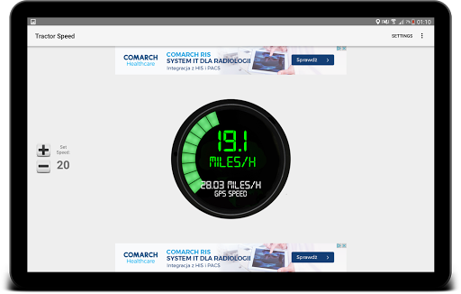 Speedometer is fitted to farm work mainly in case of fields work with constant speed. You can setup a constant speed in settings and you will be warned when speed will be exceed. Speed is displayed as current measurements and as average from last period of time.