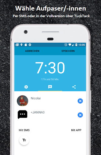 Einmal wird TuckTack zum Sms Wecker. An alle Aufpasser/-innen wird automatisch eine SMS versandt, wenn du den Wecker verschlafen hast.