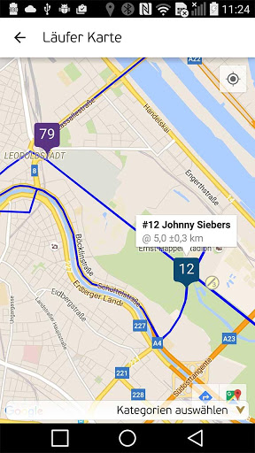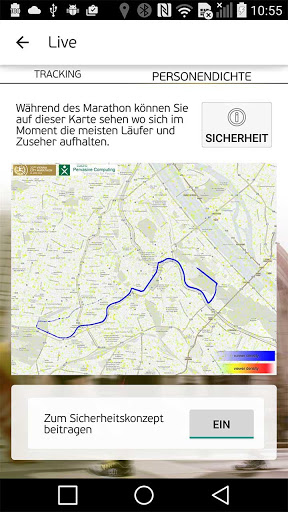 Während des Marathons können Sie den Fortschritt von Läufern Live mitverfolgen, Verhersagen für Ankunftszeiten abrufen und eine Übersichtskarte der Personendichte entlang der Strecke anzeigen.