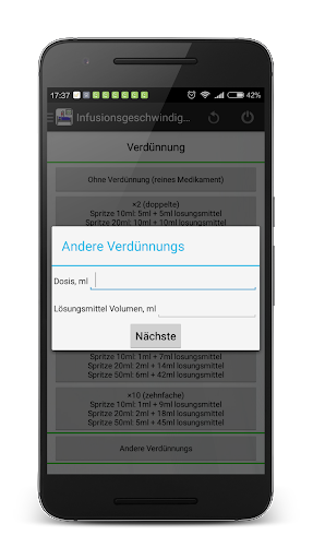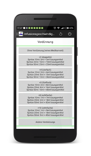 PS: Der Autor der Anwendung übernimmt keine Haftung für Berechnungsfehler. Der Arzt oder das medizinische Personal sollen immer die Berechnungen und die Richtigkeit der Verdünnung überprüfen.