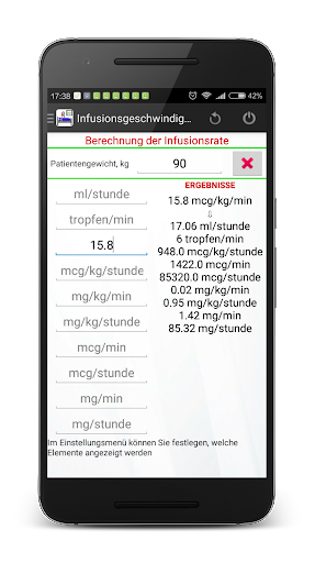 Das Programm erlaubt es, die Infusionsrate von Drogen zu berechnen. Dabei werden das Gewicht des Patienten und die verschiedenen Varianten der Verdünnung der Ausgangslösung berücksichtigt. Umrechnung von ml/h in mg/min, mg/kg(lb)/min, mg/kg(lb)/stunde, mcg/min, mcg/kg(lb)/min, mcg/kg(lb)/stunde, mcg/stunde ist schnell, einfach und erfolgt durch wenige Bildschirmberührungen. In den Einstellungen können Sie zwischen Kilogramm oder Pfund wählen.