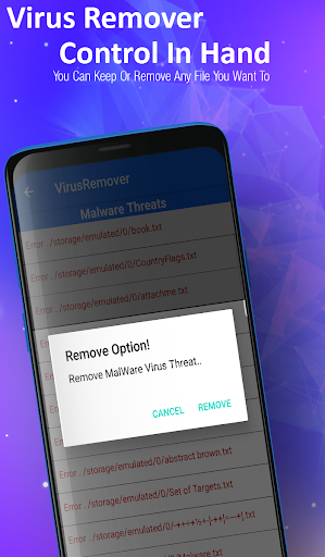 It scans your phone from viruses and after scanning it provide you the list of virus affected files. You can delete one all infected files by choosing options that are also available in Virus Scanner & Remover.