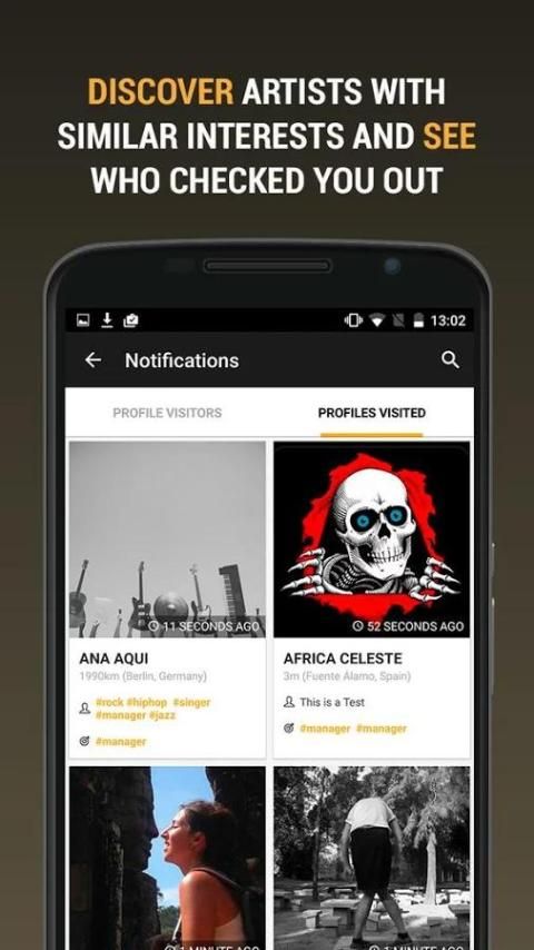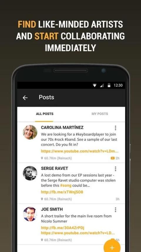 - ­Add projects to your profile by connecting your YouTube or Soundcloud account ­ Search for artists near you based on interests and other keywords.