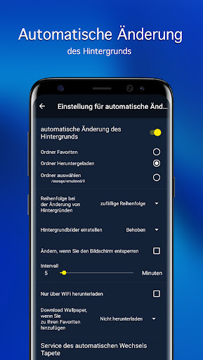 In der Anwendung wird eine automatische Hintergrundänderung Funktion (Live-Wallpaper) implementiert. Sie können die Quelle und das Intervall der Änderung selbst auswählen. Fügen Sie einfach die 4K Hintergründe zu Favoriten hinzu, ankreuzen Sie die entsprechende Position der Einstellungen und erfreuen Sie sich. Ihre allen gefallenden Bilder für Samsung werden sich auf dem Desktop und Sperrbildschirm im Wechsel ändern!