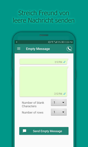 Dieser Streich für WhatsApp ermöglicht es Ihnen, leere Nachricht an Ihre Freunde zu senden. Sie können ein leeres Leerzeichen nach Zeile und Spalte festlegen und dann die leere Absenderfunktion verwenden, um eine leere Nachricht zu senden.