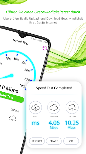 ☑ Internet-Geschwindigkeitstest: Führen Sie einen Geschwindigkeitstest für mobile Daten des Typs 2G / 3G / 4G / 4G LTE / 5G und eine WLAN-Verbindung durch, um die Upload- und Download-Geschwindigkeit des aktiven Verbindungstyps auf Ihrem mobilen Gerät zu überprüfen.