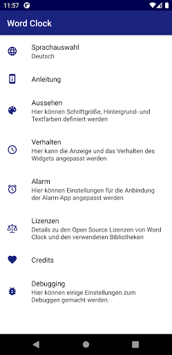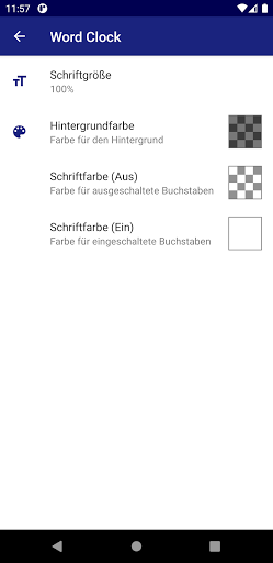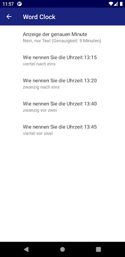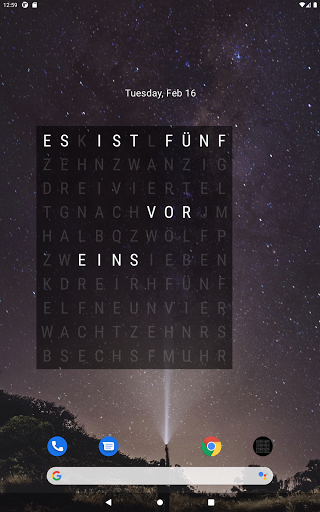 Diese App stellt ein Widget zur Verfügung, mit dem die Uhrzeit als Text dargestellt werden kann. Auf dem Widget leuchten die entsprechenden Buchstaben auf und formen die Uhrzeit als Wörter: "es ist viertel nach neun".