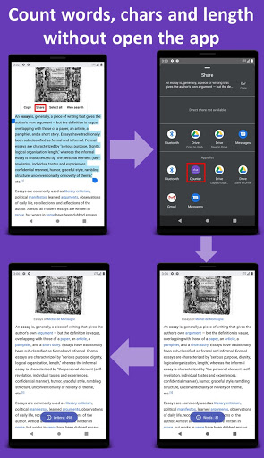 • Zähle Wörter - Buchstaben - Die Länge des Textes von draußen ohne die App zu öffnen. Ohne den ursprünglichen Text zu verlieren. Indem Sie den Text mit der App "Worte Counter" teilen.