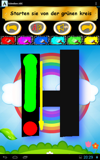 Auswahl an Farben zum schreiben hält Schreiben ABC Ihr Kind garantiert vom ersten Tag bis sie die App nicht mehr brauchen interessiert. Das nachzeichnen der Buchstaben ist in einfache Schritte unterteilt und mit hellen Pfeilen und unseren einzigartigen großen grünen und roten Kreisen gekennzeichnet, die den Anfang und das Ende des Schrittes markieren.