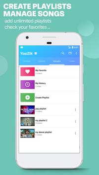YouZik is a third party music streaming youtube player, not a youtube songs downloader. It does not allow to listen to your own mp3.