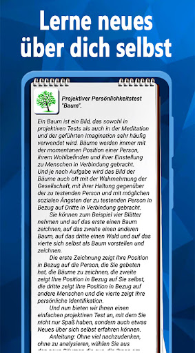 Werfen Sie einen Blick auf die Bewerbung und finden Sie heraus, welche Charakterstärken Sie haben, in welche Art von Person Sie verliebt sind, welche Beziehungen Sie bei der Arbeit und zu Ihren Mitmenschen haben. Es werden Ihnen mehr als 20 einzigartige kostenlose Tests präsentiert. Hier sind die interessantesten und kostenlossten psychologischen Tests: