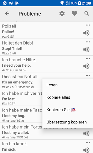 Phrase Sätze sind nach Kategorien sortiert (Lebens-Situationen), das macht es einfach, die touristische Ausflüge zu navigieren. Sound englische Ausdrücke sind mit einem Standard-TTS (falls installiert). Lernen Sie die grundlegenden englischen Phrasen für die Reise benötigt. Nehmen Sie einen Sprachführer mit Ihnen und sicher sein, in jeder Situation.