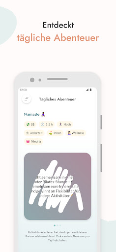 Entdecke coole Abenteuerideen, die du gemeinsam mit deinem Partner unternehmen kannst 🏔. Mit dieser Funktion gehen dir die Ideen für dein nächstes Date nicht mehr aus. Rubbel ein Abenteuer frei, speichere es für später oder absolviere es jetzt! Vergiss nicht, die lustigsten Momente zu einzufangen.