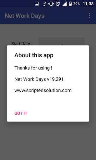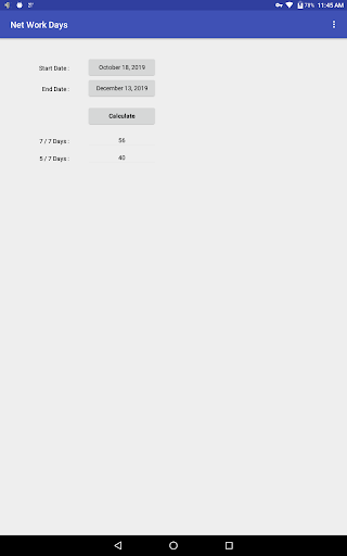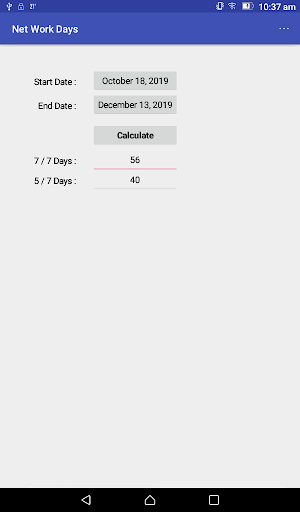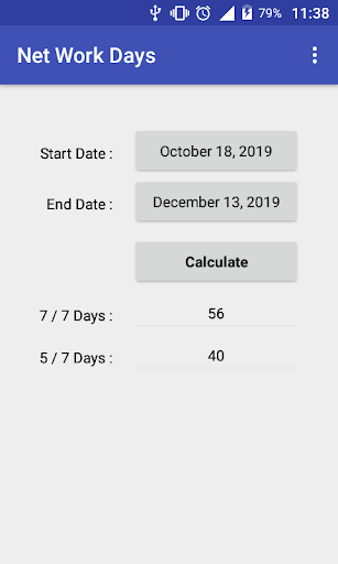 Berechnet die Anzahl der Tage zwischen zwei Terminen, sowohl für sieben bis fünf Tage lang.Nützlich bei der Ermittlung der Aufgabendauer für das Projektmanagement oder als Countdown auf ein erhebliches Ereignis.Dies ist eine kostenlose App ohne Anzeigen - Hinweis: Es läuft ein wenig langsam, aber es ist sehr genau.