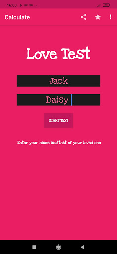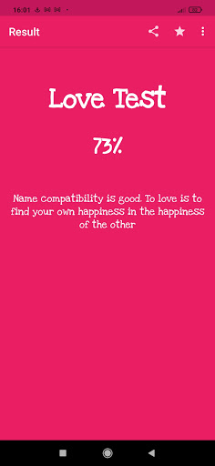 Kostenlose Testversion Liebes-Test: Namen.Durch mathematische Analysen und Umfragen in mehreren Ländern haben wir eine Formel erhalten, die die Buchstaben beider Namen vergleicht und Sie darüber informiert, wie kompatibel sie sind.Sie erhalten ein Ergebnis zwischen 0% und 100%.Sie können auch mit dem Namen, der Stadt, dem Land, dem Job, dem Job, was auch immer Sie wollen!Denken Sie daran, dass es nicht die einzige Variable für die Liebe ist.Versuchen Sie es!
