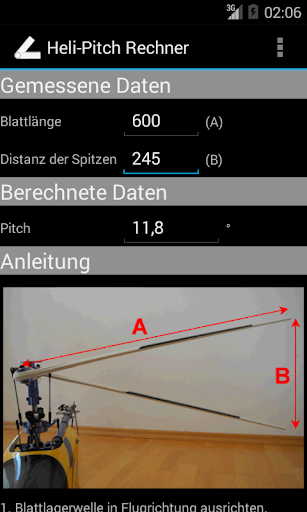 Mit dem Heli-Pitch Rechner können sie den Pitchwert durch Eingabe der Blattlänge und der Distanz der Spitzen berechnen.