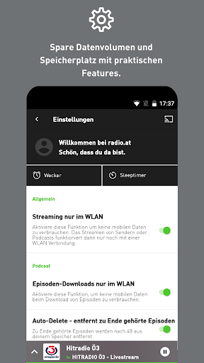 Nutze den Radiowecker und wache jeden Morgen mit deinem Radiosender oder der Morningshow deiner Wahl auf. Einfach den Sender auswählen, Weckzeit und Lautstärke des Telefons einstellen. Möchtest du auch mit deinem Lieblingssender oder Podcast einschlafen? Dann einfach deine Wunschzeit mit dem Sleeptimer auswählen und die Wiedergabe deines Radiosenders oder Podcasts endet nach der ausgewählten Zeit.