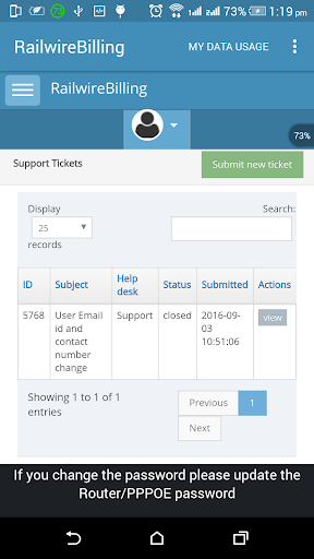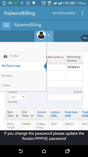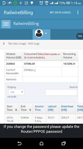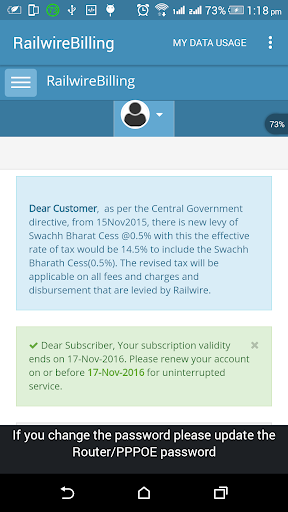 RAILWIRE-Abrechnungsanwendung für den Überprüfen der Internetnutzung in Railwire-Breitbandbenutzern aus der Region TamilNadu, von diesem Anwendungsbenutzer, können Benutzer Breitbandnutzung, Gültigkeit, Quittungen und Tickets überprüfen.