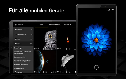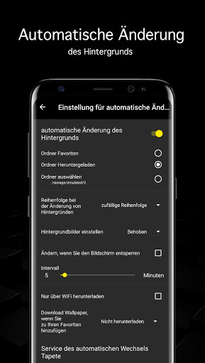In der Anwendung wird eine automatische Hintergrundänderung Funktion (Live-Wallpaper) implementiert. Sie können die Quelle und das Intervall der Änderung selbst auswählen. Fügen Sie einfach die 4K Hintergründe zu Favoriten hinzu, ankreuzen Sie die entsprechende Position der Einstellungen und erfreuen Sie sich. Ihre allen gefallenden schwarze Bilder werden sich auf dem Desktop und Sperrbildschirm im Wechsel ändern!