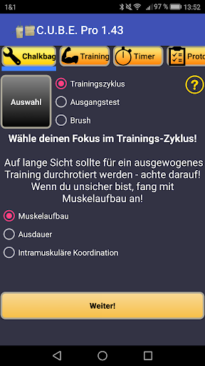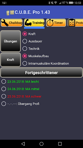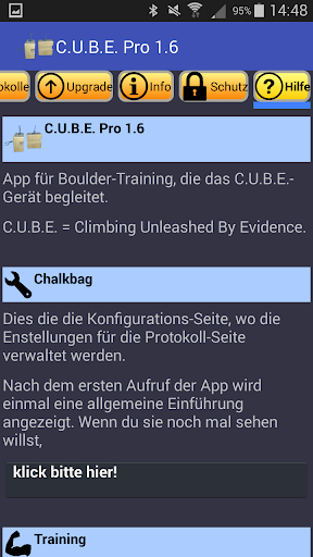 Das Programm ist eine Zusammenfassung aktueller sportwissenschaftlicher Lehrmeinungen, um strukturiert aufgearbeitet jedem Kletterer / Boulderer die Möglichkeit eines spezifischen Trainings zu bieten. Diese App gibt euch folgende Möglichkeiten: