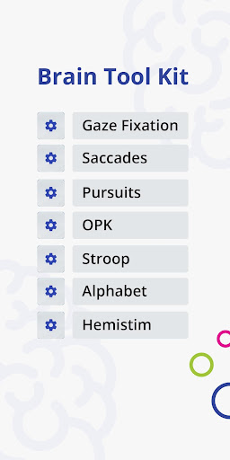 Brain Tool Kit verwendet Augenbewegungen, Speicher und farbige Reize, um das Gehirn auszuüben.Beispiele für Übungen sind als Ausgangspunkt angegeben.Zu den Optionen gehören: Blickfixierung, Verfolgung, Opk, Hemistim, Sakkaden und Anti-Saccades, zeitgesteuerter und interaktiver Stieftest, in denen der Benutzer ein spezielles Inkongruenz stimuli machen muss;und zufällige Buchstabenanzeige, mit der der Benutzer verwendet werden kann, sagt ein Wort, das mit diesem Buchstaben beginnt.Optionen für Geschwindigkeit und Aktivitätsdauer sind für jeden Artikel angegeben.Optionen für grüne, rote oder blaue Ziele sind angegeben.