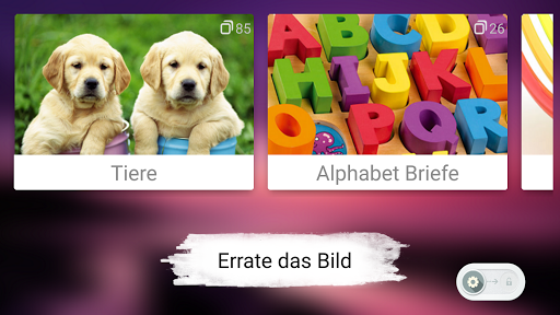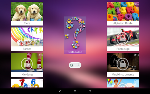 * Es sind auch ein Quiz-Spieel enthalten, wo die Kinder 4 verschiedene Bilder zeigen und aufgefordert werden, ein bestimmtes Bild zu berühren. Wenn sie das richtige Bild berühren, wird der Namen des Bildes wieder gespielt, so dass sie sich an die richtige Antwort erinnern. Die Eltern können wählen, welche Gruppen von den Bildern in den Quiz gezeigt wird.