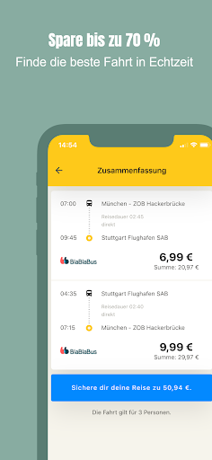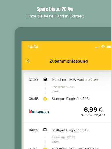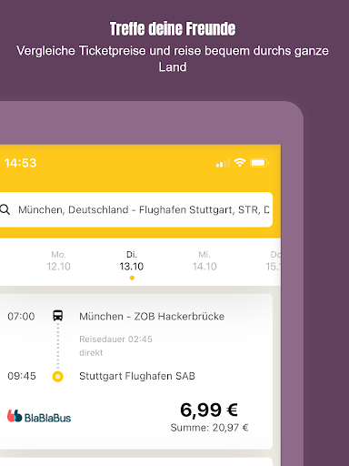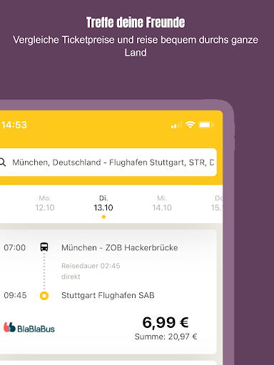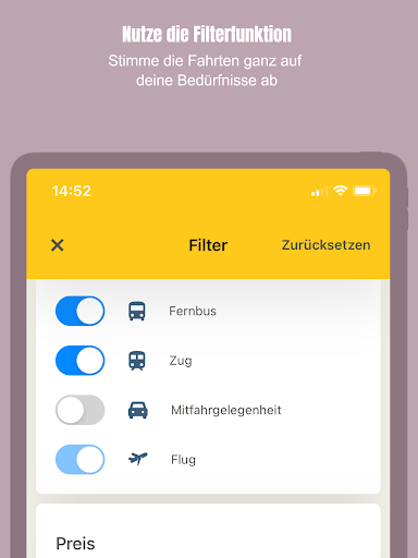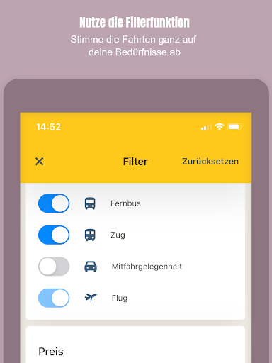 Vergleiche die Ticketpreise verschiedener Bus-Anbieter mit den Preisen für Bahn, Mitfahrgelegenheit und Flugzeug in einer Suche.