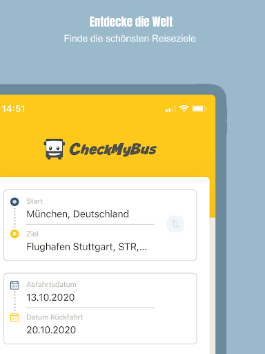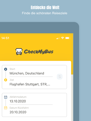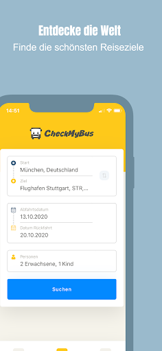 Mit der NEUEN CheckMyBus-App findest Du die besten Angebote rund um den Globus: Vergleiche Bus, Bahn, Flug und Mitfahrgelegenheiten in einer App. Wir zeigen dir auf einen Blick Preise, Abfahrtszeiten, Reisedauer, genaue Haltestellen sowie Informationen über Zusatzleistungen an Bord.