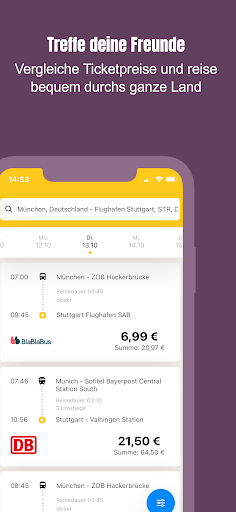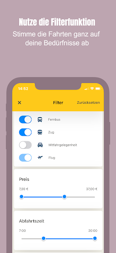 NUTZE DIE FILTER UM NOCH SCHNELLER DEINE FAHRT ZU FINDEN Schließe Verkehrsmittel aus, wähle bestimmte Haltestellen oder deinen Lieblingsanbieter. Grenze die Ergebnisse nach Preis oder Reisedauer ein und finde noch schneller die perfekte Fahrt!