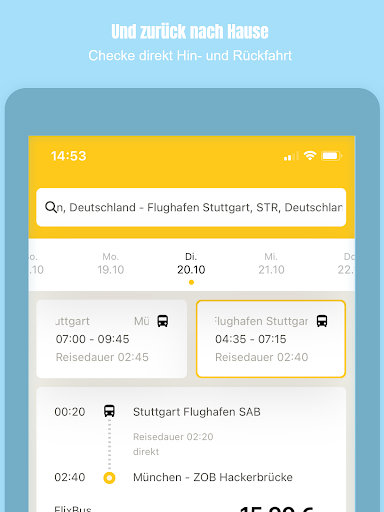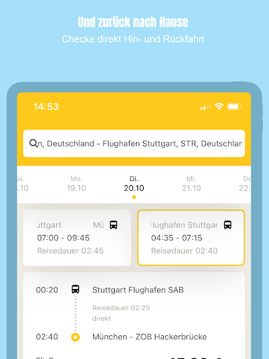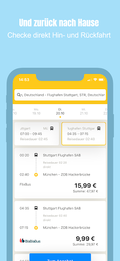 Checke alle Angebote auch direkt für die Rückfahrt. Sortiere die Ergebnisse ganz einfach nach Abfahrtszeit, Preis, Haltestelle, Anbieter oder Reisedauer.