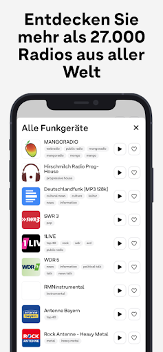* Die Logos der in der Anwendung enthaltenen Radios sind Eigentum der jeweiligen Besitzer und werden nur zur Identifizierung der Radios angegeben. Die Logos der Radiosender in der Vorschau sind die von Radio Paloma, WDR 2, bigFM, KISS FM 98.8, SWR3, ENERGY Berlin, DasDing, Antenne 1, Radio SAW, hr4, N-JOY, RSH. Diese Anwendung ist nicht mit diesen Radiosendern verbunden.