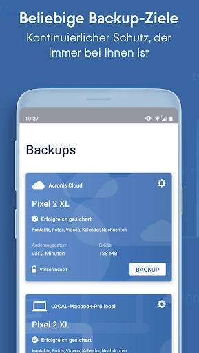Schützen Sie die Daten Ihrer Mobilgeräte vor versehentlichen Löschungen, Geräte-Verlust und Online-Angriffen. Mit dem neuen Acronis Mobile können Sie Ihre Kontakte, Fotos, Videos, Kalendereinträge und Textnachrichten von Ihrem Smartphone oder Tablet sichern und schnell, einfach und zuverlässig wiederherstellen. Migrieren Sie Ihre Daten leicht von iOS zu Android (und umgekehrt).