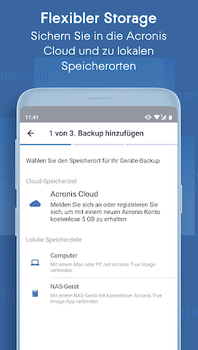 * Gleichzeitiges Backup in die Acronis Cloud und zu lokalen Windows-/Mac-Computern erfordert ein aktives Abonnement von Acronis True Image auf dem entsprechenden Desktop-PC/Laptop. Mobilgeräte-Backup zu einem NAS-Gerät erfordert die Installation der kostenlosen Acronis True Image NAS App.
