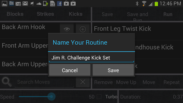 These moves are creatively assembled in a shadow style kick boxing workout. This creative implementation will reinforce TaeKwonDo techniques; provides a vigorous workout, and aids in self-defense. These techniques are not normally used in sparring and can be quite challenging even for experienced martial arts fans. There is an embedded video of Master Bill executing every move. Each move also contains a brief description and can be viewed before you add it to your routine.