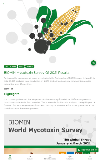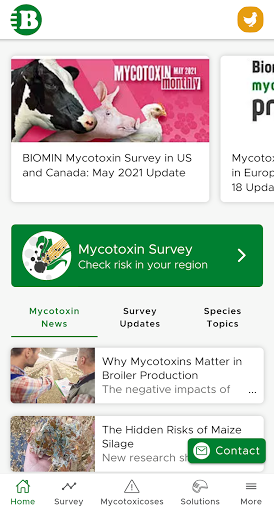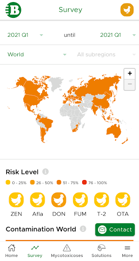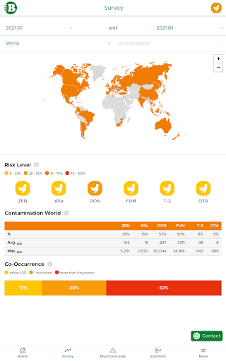 Diese Anwendung ist ein nützliches Instrument für alle landwirtschaftlichen Fachleute, die schnelle Daten und Informationen zum Auftreten von Mykotoxinen und deren Kontaminationsstufen rund um den Globus benötigen.